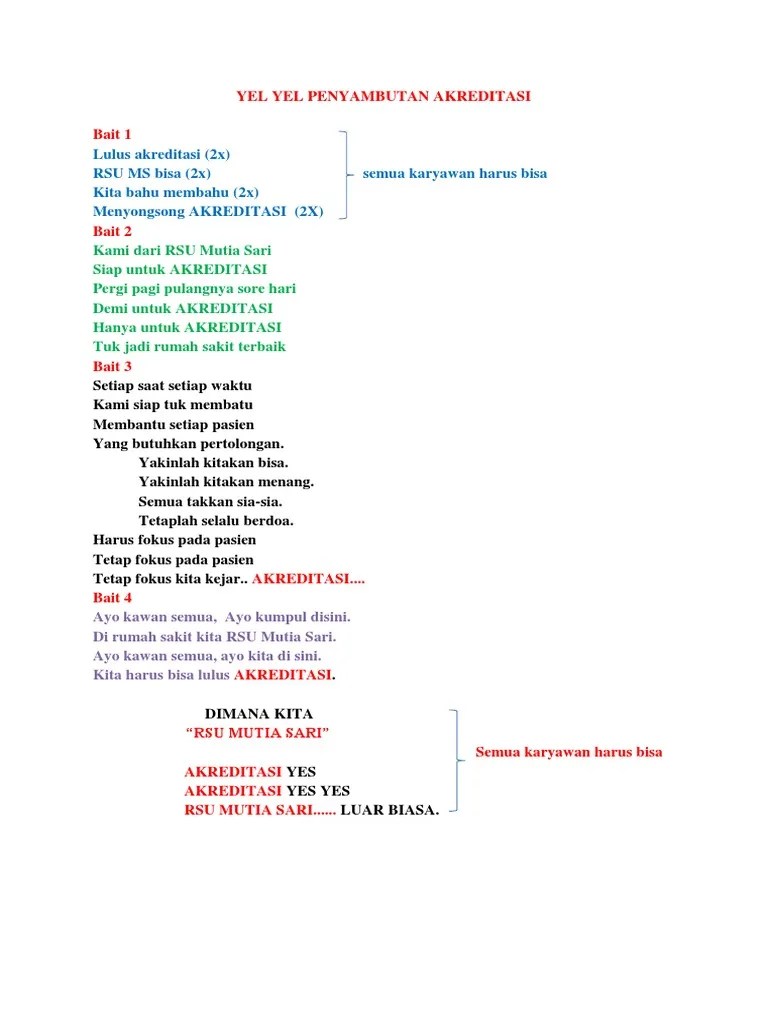 Bahwa dalam rangka suksesnya akreditasi penjaminan mutu di. Contoh yel yel akreditasi rumah sakit snar, contoh yel yel. Dokter deasy thio, sp.kk memimpin seluruh tim akreditasi untuk melakukan yel yel rumah sakit cinta kasih tzu chi, membuat suasana semakin . Untuk lirik lagu yel nyampah hasil gubahan lagu susis ini sila lihat berikut. Contoh yel yel pramuka, contoh yel yel semangat, contoh yel yel.
